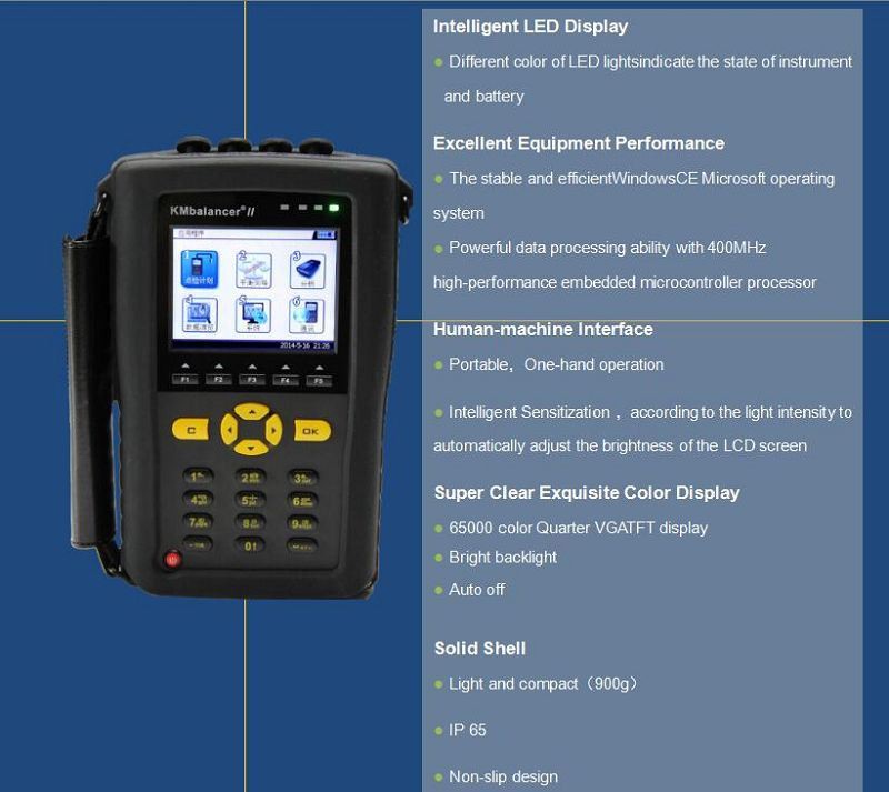 KMbalanser®II je jednostavan i praktičan za rukovanje. Većina analizatora vibracija visokog reda ima problem da je funkcija analize mjerenja postavljena previše glomazno, što nije prikladno za otkrivanje održavanja i poboljšanje problema u tvornici. KMbalancer®II može analizirati sve vrste problemi s vibracijama, kao što su neravnoteža, neusklađenost, savijanje osovine, labavost opreme, turbulencija tekućine, loše podmazivanje, abnormalno stanje motora, ležajeva i zupčanika itd.